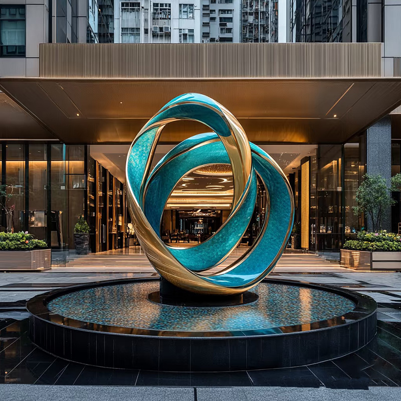 This is a modern composite material sculpture inspired by "Symbiotic Ring / Urban Rhythm", which fuses retro verdigris aesthetics with contemporary metal craftsmanship. It is a commercial landmark installation that combines cultural texture with striking visual tension.