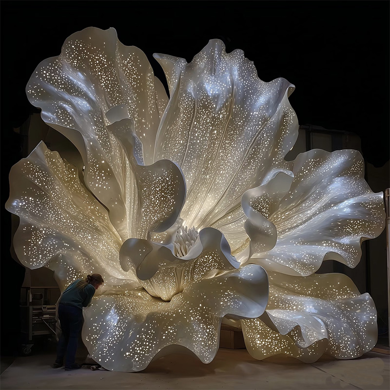 Inspired by a fully bloomed giant flower, this installation is crafted from semi-translucent composite material, with laser-engraved starry holes that shimmer like a galaxy when lit by internal LED sources. Its wavy, outstretched petals balance soft natural elegance with futuristic tech appeal. More than an artwork symbolizing vibrant life and warm comfort, it serves as a traffic-driving centerpiece for commercial spaces and art exhibitions, creating an immersive, dreamlike atmosphere that elevates spatial aesthetics.