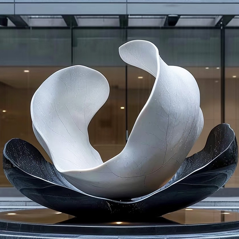 Inspired by the blooming magnolia and the concept of inclusive symbiosis, this sculpture is crafted from fiberglass. Its white surface features a crackle glaze texture for a delicate porcelain-like finish, while the black base is finished with high-gloss paint and speckled details. The semi-open petal design creates a striking visual contrast between black and white, with smooth curves balancing gentle elegance and avant-garde artistry. The magnolia symbolizes purity, new beginnings, and inclusiveness, and the black-and-white palette conveys a minimalist, refined temperament, making it an iconic installation for high-end office buildings and commercial complex entrances to elevate spatial style and enhance brand identity.