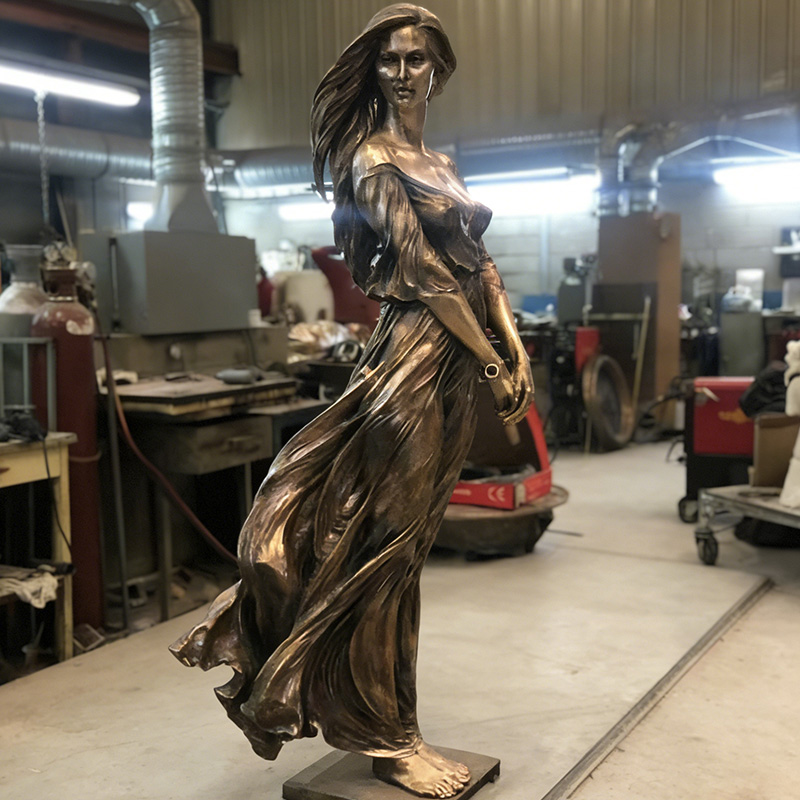 This Melody of the Wind takes "the wind goddess playing the flute" as its core inspiration, standing as a modern realistic sculpture. Crafted from fiberglass or bronze, it achieves a texture contrast through layered coloring: the warm golden skin is delicate and smooth, while the white gauze dress uses flowing textures to mimic the form of fabric billowing in the wind, with natural, fluid lines in the hair and folds. The work depicts a woman holding a flute and moving forward against the wind, conveying an atmosphere of poetic romance and a soft yet resilient life force, with the fluttering dress and hair enhancing the imagery of "rhythm of the wind". Ideal for display in high-end hotels, art clubs, private residences, and landscape parks, it serves as an iconic installation to create a romantic and elegant atmosphere.