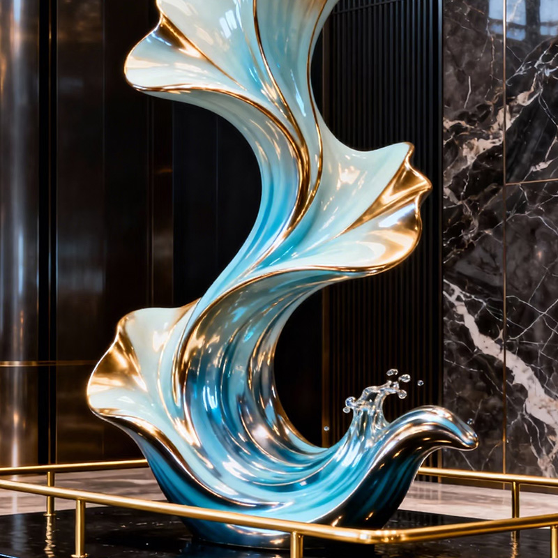 The designer leverages the toughness and luster of FRP to immortalize the fleeting dynamism of nature, preserving the light rhythm of waves while infusing the sculpture with a modern, light-luxury elegance through metallic lines. It is both a tribute to the vitality of the ocean and a metaphor for the grace and resilience that urban dwellers maintain amid the rush of daily life.
